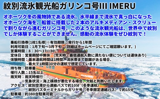 容量:紋別流氷観光船ガリンコ号Ⅲ IMERU乗船引換券[1枚1名様]\\n※有効期限:発行から1年間\\n利用可能日:1月下旬~3月下旬(詳細はホームページにてご確認願います。)\\n営業時間:8:30~17:30\\n定休日:営業期間中無休(荒天時・最低運航人数に満たない便については運休あり)\\n体験時間:基本運航時間は1時間、流氷帯まで距離がある場合、最大で1時間30分の運航で想定しています。\\n持ち物:防寒着\\n催行人数:15名以上\\n雨天時:雨天時催行 ※気象状況・海上模様が悪化する場合、欠航と判断いたします。\\nアクセス:紋別空港から連絡バスで約10分(冬季運航)紋別バスターミナルからガリヤ号(冬季限定連絡バス)で約15分 \\n駐車場:約380台駐車可能