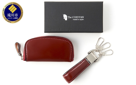 - キーホルダー 幅20×高さ80×奥行20mm キーフック 3ケ付 小銭入れ 幅100×高さ50×奥行20mm ファスナー開閉仕切り付(内側差し込みポケット有) 各素材 表:コードバン/裏:馬革 カラー ワイン 重量各40g
