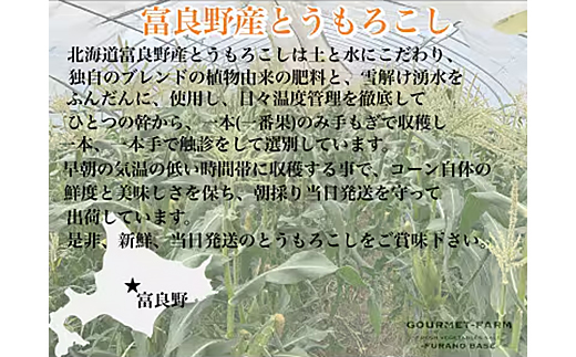 ◆ハウス栽培ホワイトコーン「雪の妖精」 北海道富良野市山部は周りを山々に囲まれた富良野盆地です。 富良野盆地は盆地特有の朝晩の寒暖の差が大きく、気候も空気も良く作物の栽培に適した土地柄です。 匠の職人が独自の配合の植物由来の肥料と雪解け湧水を使用し温度管理と水分管理を徹底して丁寧に育てています。 収穫は早朝の気温の低い時間帯に収穫する事で、美味しさと栄養価を逃さず出荷出来ます様に、朝採り当日発送しています。 1番果だけを収穫して出荷しています。 選別は、専任の職人が1本、1本丁寧に手で触診して選別しております。 フルーティーな風味と甘さが口に広がり、シャキッシャキッ感も特徴のひとつです。 約20年にわたり全国の大手百貨店、お中元ギフトなどの高級ご贈答用として、取り扱いをして頂いております。 返礼品にも品質は変わらないクオリティのお品を出荷させて頂きますので宜しくお願い致します。 ■生産者の声 ◆土づくりと温度管理と水分管理 土づくりは農作物に対して要になる重要な土台です。 ですので、昔からながらの知恵と現代までのデータを合わせ新しい農法を日々研究し毎年作物に合う様にアップデートしています。 土は作物にとって良くも、悪くも左右しますので、手を抜けません。 自分たちが食べてみて、美味しく無いと感じる物は出荷出来ません。 皆さんに美味しいと食べて頂く為に 日々努力しております。 雪解け湧水を使用し毎日の温度管理にも手を抜けません。 努力と匠の経験が生みなすホワイトコーンを召し上がって下さい。 ■注意事項/その他 ※農作物ですので、天候不順により収穫が遅れる場合がございます。 ※保管方法は食べきれない場合はなるべく立てて冷蔵庫に入れ冷蔵保存して下さい。 冷蔵保存する場合は外側の皮は剥かずに付けたまま、冷蔵保存し召し上がる直前に皮を剥いて茹でるか、レンジで温めてお召し上がり下さい。 ※生育状況により出荷が前後する場合がありますのでご理解下さい。 ※直射日光を避けて下さい。 到着後は長期保管はなるべく避けて、お早目にお召し上がりいただくことをお勧めします。 ※画像の色味はご覧になる環境によって、実際の製品と異なる場合がございます。 ご了承下さい。