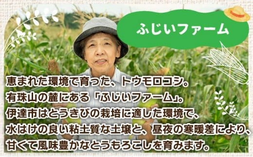 【オンライン決済限定商品】【先行受付】 【お届け:2025年7月下旬~10月上旬まで】 北海道伊達市より、ふじいファームのとうもろこし 「恵味」を産地直送でお届け。 新鮮で美味しいトウモロコシを、ぜひお楽しみください。 ■恵まれた環境で育った、トウモロコシ 有珠山の麓にある「ふじいファーム」。 伊達市はとうきびの栽培に適した環境で、水はけの良い粘土質な土壌と、昼夜の寒暖差により甘くて風味豊かなとうもろこしを育みます。 ★恵味 イエロー種の中でも甘い品種。 鮮やかで光沢のある黄金色の粒が、先端までぎっしり詰まっています。 すっきりとした甘みと香ばしさを兼ね備えた、昔ながらの味わい。 平均糖度は18度と甘く、かじりつけばコクのある甘みが広がります。 生食ができるほど薄皮のため、 食べやすく歯にも引っかかりにくいのが嬉しいポイント♪ <美味しい食べ方> とうもろこしは鮮度が命!まずは生でお召し上がりください。 新鮮でジューシーな味わいを堪能できます。 ■茹でて美味しい 外皮をむいたら、薄皮一枚と、ひげを残し、そのまま茹でてください。 甘みと食感を楽しむことができます。 ■焼きトウモロコシ 醤油をつけて軽く焼くだけで、香ばしさと美味しさが広がります。 甘みが引き立ち、香りも芳醇でたまりません。 北海道の旬の野菜をぜひ、ご家庭でご賞味ください! ※画像はイメージです。 ※こちらの返礼品は、オンライン決済限定商品です。 ※出荷時期になりましたら、別途メールにてお届けについてのご案内をさせていただきます。 ※返礼品到着日の指定はお受けできません。 ※お申込限度数に達した場合は、予告なく締切日前にお申込みを締切る場合がございますので、あらかじめご了承ください。 ※天候や収穫状況により手配ができない場合は別途ご連絡させていただく場合がございます。 ※発送から冷蔵5日程度