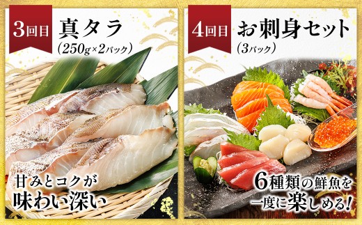 4ヶ月間、毎月旬の味が届くので、ご家庭で手軽に北海道の味覚を満喫できます。\\n\\n【内容】\\n1回目:ホタテ 250g×2パック\\n2回目:お刺身セット×3パック\\n3回目:紅鮭 切身(2切れ)×5パック\\n4回目:メンメ 70g×2パック\\n\\n\\n【各商品の詳細】\\n1. ホタテ\\n釧路町で加工された、新鮮でぷりぷりのホタテです。\\n250gずつ小分け真空になっているので、使い勝手抜群!冷凍焼けを防ぎ、鮮度を保ちます。\\n解凍するだけで、お刺身、バター焼き、フライなど、様々な料理にお使いいただけます。\\n小分けの理由:冷凍焼けによる品質劣化を防ぎ、美味しさを長持ちさせるためです。\\n解凍方法:冷蔵庫で4~6時間解凍、または流水解凍。\\n\\n2. お刺身セット\\n6種類の新鮮な魚介を厳選し、食べやすい大きさにカットしました。\\nサーモン、クロマグロ、イクラ、旬の白身魚、ホタテ、甘エビが一度に楽しめます。\\n解凍するだけで、お刺身、海鮮丼、手巻き寿司など、様々な料理に!\\n小分けパックなので、必要な分だけ解凍して使えます。\\n\\n3. 紅鮭\\n脂のり抜群の紅鮭を、極切りにしました。\\nご家庭で手軽に、紅鮭の旨味を味わえます。\\n2切れずつ個包装になっているので、使い勝手も抜群です。\\nスモーク、塩漬け、焼き魚など、様々な料理に。\\n\\n4. メンメ\\n地元でも高級魚として知られるメンメ(キンキ)を、お刺身にしました。\\nまろやかな甘味と、とろけるような食感が特徴です。\\n解凍するだけで、手軽にメンメの美味しさを楽しめます。\\n\\n【保存方法】\\n※到着後は要冷凍(-18℃以下)で保存して下さい。\\n※解凍する時は、できるだけ低い温度でゆっくり解凍し、半解凍になったら直ちに調理してください。\\n※一度解凍したものを再度凍らせると品質が変わる事がありますので、ご注意ください。\\n※解凍後は要冷蔵(10℃以下)で保存し、お早めにお召し上がり下さい。