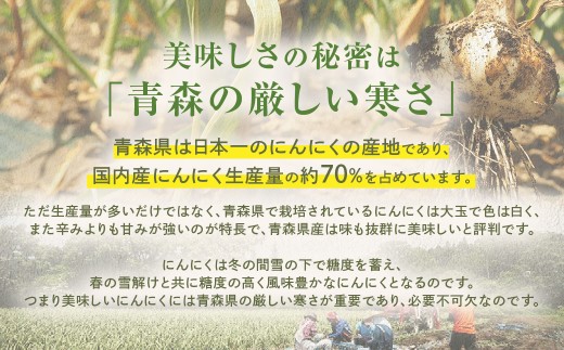 昼夜の寒暖差が生み出した甘味と風味は、青森県三戸町ならでは! \\nこちらのお品は、見た目、品質ともに最高の「青森県産にんにく」。 \\n\\n 規格は、中サイズ/大サイズ/特大サイズをご用意しております。 \\n品種は、粒が大きく、瑞々しく甘味があるにんにく「ふくちホワイト6片」です。 ぜひお試しください! \\n\\n※冷蔵庫保管で長持ちします。また、ひとつひとつ剥いて冷凍保存も可能です。 \\n※画像はイメージです。 \\n\\n\\n【提供事業者】にんにくのよしだ家