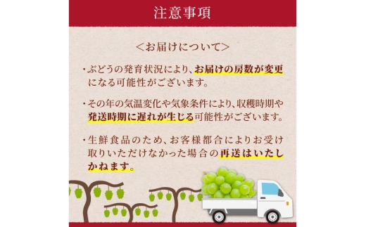 太陽の恵みをたっぷり受けて育ったシャインマスカット。 爽やかな甘みとジューシーな果汁、上品な香りが特徴です。 1粒1粒が大きく、パリッとした食感と芳醇な香りをお楽しみいただけます。 【ご注意事項】 ※季節品のため配送日指定やお届け日についてのお問合せは承っておりません。お申込み順に順次出荷いたします。 ※発送時期は、例年の発送時期を記載しております。天候や収穫状況により変更になる場合があります。 ※天候や収穫状況により、ご希望のお礼の品をご用意できず代替品をご用意する場合がございますので予めご了承ください。 ※種なし品種の場合でも、天候等によりまれに種が混入する場合があります。 ※配送時の揺れや傾きにより若干の傷・脱粒が生じる場合がございます。 ※お礼の品受取後、すぐにお礼の品の状態をご確認ください。万が一ひどい傷み等があった場合は、現品と交換させていただきます。 写真・画像を添付の上到着から翌日までにお問合せセンターまでご連絡ください。お時間が過ぎてからの交換は致しかねます。 ※画像はイメージです。パッケージ・デザインが変更になる場合もございます。 ※長期不在によりお礼の品をお受け取りになれない場合の保証は致しかねます。 ※到着後、すぐに冷蔵庫での保管をお願い致します。温度変化で傷みやすくなります。 ※期間内にお申込みいただいた場合でも、決済状況により次年度のお届けとなる場合がございますので予めご了承ください。