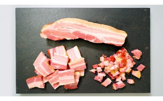 低温熟成した豚バラ肉を、燻製職人が桜の原木を使いじっくりとスモークをかけ、約8時間熱入れをして余分な脂を取り除きました。\\n残った脂が甘みと香りを醸し出したベーコンに仕上げました。\\nパラパラ状のカットから、厚切り、ブロックと、幅広いお料理にお使いいただけます。\\n重量感たっぷりのセットになります。(野菜炒めやポトフに最適!)\\n\\n【工夫やこだわり】\\n当社の商品は、茨城県銘柄豚「ローズポーク」および茨城県銘柄豚「キングポーク」を使用しております。豚の飼育方法では、出荷の2か月前に全ての薬物投与を止め、抗生物質などの薬物残留を無くしています。そして豚肉を加工するにあたり、熟成液の塩分は少なめにし、更に食品添加物は極力使用を控えておりますが、許可基準よりはるかに少ない量の亜硝酸塩は細菌(ボツリヌス菌)発生を抑制するために使用しております。またリン酸塩はソーセージの結着のために許可基準以下にて使用しております。その他の防腐剤、保存料、異種蛋白による増量剤等は一切使用しておりません。\\n\\n【保存方法】\\n要冷凍