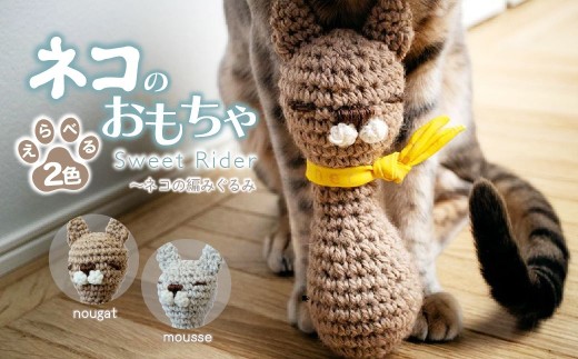 <Sweet Rider>ねこのおもちゃ 猫キック\\n\\n大人気ねこの編みぐるみシリーズに新しいキャラクターが登場!\\nキャッチ―なマフラーをなびかせたネコライダー『Sweet Rider』です。\\nいつも一緒にツーリングしている2人\\n甘いものが大好きで、お鼻がホイップクリームになっちゃいました♥\\n\\nスイートライダーは、肌触りも抜群。\\n天然素材なので子猫ちゃんにも安心して遊んでもらえます。\\n噛んでも、投げても、抱っこして寝ても、枕にしても大丈夫。\\nマフラーは取り外しも可能です。\\n\\n愛らしいヌガーと上品なムース、どちらも魅力的!\\nマフラーは全5色、マフラーの色は届いた時のお楽しみです♪\\n\\n癒やしと楽しさを提供してくれるおもちゃはストレス発散やリラックスタイムに最適。\\n\\nお部屋のインテリアとしても映える、おしゃれなデザインなので\\nプレゼントとしても喜ばれること間違いなしです。\\n\\n染料を使わず、原毛本来の色をブレンドして作られた\\n環境にやさしいエコロジーウールを使用し、丁寧に手編みで仕上げています。\\n\\n一体一体に手作りならではの温かさと個性が宿っています。\\n『Sweet Rider』、新しい友達と一緒に楽しい日々を!\\n\\n\\n※本製品はハンドメイドによるものですので商品によって多少の個体差(大きさ・形・色合)がございます。\\n※マフラーのお色はお選び頂くことができません。予めご了承下さい。