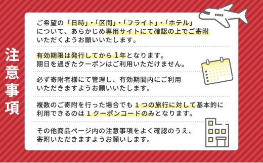 - 【有効期限:クーポン発行日より1年間】 パッケージ商品のツアー費用に充当できる旅行クーポン<9,000円分> ご寄附後(入金確認後)5営業日に(年末年始は除く)メールにてクーポンコードを発行します。返礼品の発送はありません。 ポータルサイトの【備考欄】または【要望欄】にメールアドレスをご記載ください。 【[email protected] 】からのメールを受信できるよう設定を必ずお願いします。 <対象路線> 目的地:大田区 出発地:日本全国各地 航空会社:日本航空・スカイマーク・Peach Aviation <対象ホテル> 大田区内のホテル ・変なホテル東京・羽田 ・ホテルオリエンタルエクスプレス東京蒲田 ・ホテルルートイン東京蒲田 ・羽田エクセル東急 ・チサンホテル蒲田 ・チサンイン蒲田 ※今後も順次追加を予定しております。 ※大田区の宿泊を必ず1泊含めてお申込み下さい。1泊2日~1泊14日迄予約可能です。 ※大田区のみで13泊14日や大田区1泊のその他地域との組み合わせ予約も可能です。 <予約方法> ご希望の「日時」・「区間」・「フライト」・「ホテル」について、あらかじめ専用サイトにて確認の上でご寄付いただくようお願いいたします 1)寄付金のお支払いが確認でき次第、旅行クーポンコードをメールでお届け ※旅行予約時に使用するクーポンコードになりますので大切に保管して下さい。 ※メール紛失時の再発行については、日本空輸株式会社(092-431-8866)へご連絡ください。 2)専用サイトより、日時・区間・フライト・ホテルを選択して予約 3)クーポンコードの入力方法 ・ダイナミックエクスプレス商品:商品申込ページ内のクーポンコード入力欄にクーポンコードを入力、登録を押す ・上記以外商品:商品ページの予約入力画面(希望日カレンダー表示を押した後の画面)/その他ご要望等に上記クーポンナンバーを入力 4)「ふるさと納税クーポン」が適応されたら完了 <お問合せ> 日本空輸株式会社 TEL:092-431-8866 営業時間:平日10時~17時