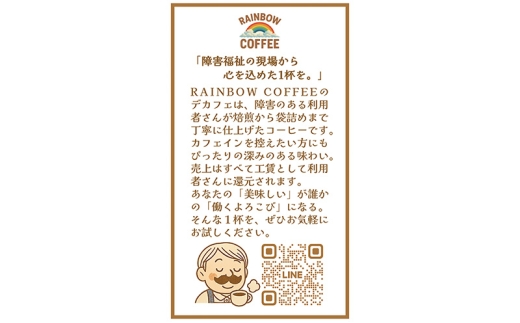 「障害福祉の現場から心を込めた1杯を」 RAINBOW COFFEEのデカフェは、大田区の障害者就労支援施設「レインボーワークス(就労継続支援B型)」の利用者さんが、焙煎から袋詰めまで丁寧に仕上げたコーヒーです。 カフェインを控えたい方にもぴったりの深みのある味わい。 商品の売上はすべて工賃として利用者さんに還元されます。 あなたの「美味しい」が誰かの「働くよろこび」になる。 そんな1杯を、ぜひお試しください。 なお、パッケージに記された[GRECIAL]は、当法人が運営する自社レストランの名前。 焙煎したコーヒーは、GRECIALの店舗でもご提供しています。 ※画像はイメージです。 ※お受け取り後、賞味期限をご確認ください。 ※開封後は賞味期限にかかわらずお早めにお召し上がりください。 ※品質保持のため封入している脱酸素剤は食べられません。お子様の誤飲にご注意ください。