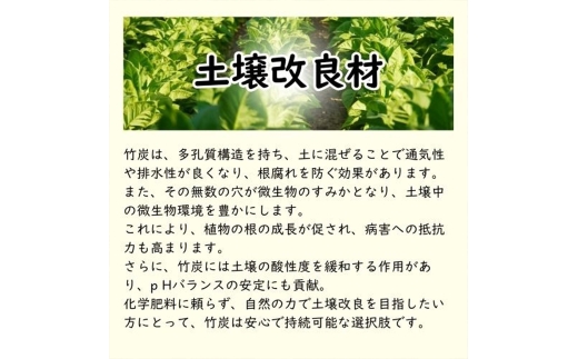 伊勢原市内で製造したポーラス竹炭です。\\n高温で焼き上げ、粉砕した後5mmから10mmにふるいがけをした粒状の竹炭です。\\n\\n用途は土壌改良、消臭剤、調湿材など様々です。\\n\\n【お申し込み前に必ずご確認ください】\\n※ご不在や転送等で配達に時間を要した場合、品質(稀に粉砕された竹の葉枝の混在)を理由とした再送およびキャンセルはお受けできかねます。\\n※万が一、届いた返礼品に破損などがあった場合は、必ず画像撮影の上、発送される前にご連絡ください。\\n※画像はイメージです。\\n\\n■提供事業者:株式会社梅鉢TMC