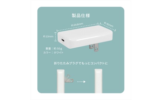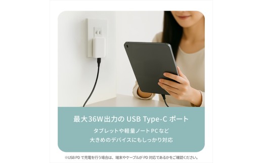 - ■対応機種: スマートフォン、タブレット、PD対応のノートPC、スマートウォッチ、ワイヤレスイヤホン、ポータブルゲーム機、Wi-Fiルーター、オーディオプレーヤー、その他USB機器 ※接続する機器に合わせたケーブルをご用意ください。 ※すべての機器での動作を保証するものではありません。 ■入力仕様:AC100V-240V 50/60Hz 0.8A ■出力仕様: USB Type-C:DC5V/3A、DC9V/3A、DC12V/2.75A、DC15V/2.4A、DC20V/1.8A (最大36W) ※充電環境により供給される電流値は異なります。 ※USB Power Delivery (PD)で充電する場合は、接続機器とケーブルがPDに対応していることをご確認ください。 ■サイズ (本体): 約 41(W) × 64.8(D) × 13(H) mm (電源プラグは除く) ■重量 (本体):約 50g ■保証期間:1年間