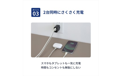 - ■対応機器:スマートフォン、タブレット、スマートウォッチ、ワイヤレスイヤホン、ポータブルゲーム機、その他USB機器 ※接続する機器に合わせたケーブルをご用意ください。 ※すべての機器での動作を保証するものではありません。 ■入力仕様:AC100-240V 50/60Hz 0.8A ■出力仕様: USB Type-C:DC5V/3A、DC9V/3A、DC12V/2.91A、DC15V/2.33A、DC20V/1.75A(35W Max) PPS1:DC3.3-11V/3A PPS2:DC3.3-16V/2A USB Type-A:DC5V/3A、DC9V/3A、DC12V/2.5A、DC20V/1.5A(30W Max) USB Type-C + USB Type-A:DC5V/3A(15W Max) ※充電環境により供給される電流値は異なります。 ※USB Power Delivery (PD)で充電する場合は、接続機器とケーブルがPDに対応していることをご確認ください。 ■保護機能:過電流保護、過電圧保護、短絡保護 ■サイズ (本体):約 29(W) × 54(D) × 39(H) mm(電源プラグは除く) ■重量 (本体):約 57g ■保証期間:2年間