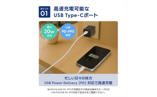 最大PD20W出力に対応した「スマホ充電器」としておすすめのAC充電器です。もちろん、スマートフォン以外にもタブレットやUSB機器の充電にもおすすめです。 従来の半導体素材であるシリコンよりも優れた充電効率をもつ、窒化ガリウム(GaN)を採用。高出力化と小型化を両立しながら、充電時の発熱を抑制します。 USB PD(Power Delivery)に対応し、最大20Wの急速充電が可能です。スマートフォンやタブレットの充電に最適です。 【注意事項】 【海外で使用する場合】 事前に渡航先の電圧と、変換プラグの必要可否をご確認ください。(変換プラグは付属しておりません。) また、以下の場合の保証対応は致し兼ねますので、ご注意ください。 ・日本国外からの保証依頼 ・日本国外で使用した際の動作保証 ・日本国外で使用する際の仕様や使用方法等のサポート ・日本語以外の言語でのサポート