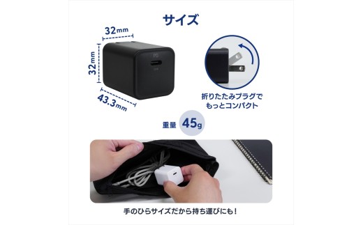 - ■対応機器:スマートフォン、タブレット、スマートウォッチ、ワイヤレスイヤホン、ポータブルゲーム機、その他USB機器 ※接続する機器に合わせたケーブルをご用意ください。 ※すべての機器での動作を保証するものではありません。 ■入力仕様:AC100-240V 0.7A 50/60Hz ■出力仕様: PD3.0:DC5V/3A、 DC9V/2.22A、DC12V/1.67A PPS:DC3.3-5.9V/3A、DC3.3-11V/2A(20W Max) ※充電環境により供給される電流値は異なります。 ※USB Power Delivery (PD)で充電する場合は、接続機器とケーブルがPDに対応していることをご確認ください。 ■保護機能:過電流保護、過電圧保護、短絡保護 ■サイズ (本体):約 32(W) × 43.3(D) × 32(H) mm(電源プラグは除く) ■重量 (本体):約 45g ■保証期間:2年間
