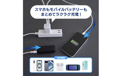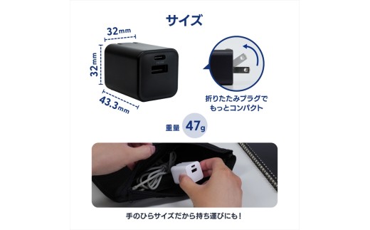- ■対応機器:スマートフォン、タブレット、スマートウォッチ、ワイヤレスイヤホン、ポータブルゲーム機、その他USB機器 ※接続する機器に合わせたケーブルをご用意ください。 ※すべての機器での動作を保証するものではありません。 ■入力仕様:AC100-240V 0.7A 50/60Hz ■出力仕様: USB Type-C: [PD3.0] DC5V/3A、DC9V/2.22A、DC12V/1.67A [PPS] DC3.3-5.9V/3A、DC3.3-11V/2A(20W Max) USB Type-A:DC5V/3A、DC9V/2A、DC12V/1.5A(18W Max) USB Type-C + USB Type-A:合計 DC5V/3A(15W Max) ※充電環境により供給される電流値は異なります。 ※USB Power Delivery (PD)で充電する場合は、接続機器とケーブルがPDに対応していることをご確認ください。 ■保護機能:過電流保護、過電圧保護、短絡保護 ■サイズ (本体):約 32(W) × 43.3(D) × 32(H) mm(電源プラグは除く) ■重量 (本体):約 47g ■保証期間:2年間