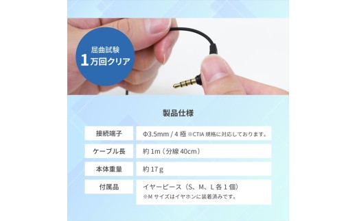 左右どちらの耳でも装着可能で周囲の音を聞きながら通話できます。現場などで作業をしながらの通話ができ、インカムに最適です。 弊社独自の厳しい条件下で1万回の屈曲試験を行っても断線が見られなかった、耐久性の高いイヤホンです。またL字プラグが根元にかかる負荷を軽減します。 エレクトレットコンデンサーマイクを搭載し、高音質な通話が可能です。 マイク部分には操作用のボタンがあり、マイクのオン/オフや通話/終話、音楽の再生/停止などができます。また、クリップ付きでお好みの場所に装着できます。 ※使用するアプリケーションによってはボタンの動作が異なる場合があります。 S/M/Lの3サイズで、お使いいただく方の耳にフィットするサイズをお選びいただけます。 ※Mサイズは本体に装着済みです。