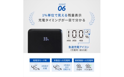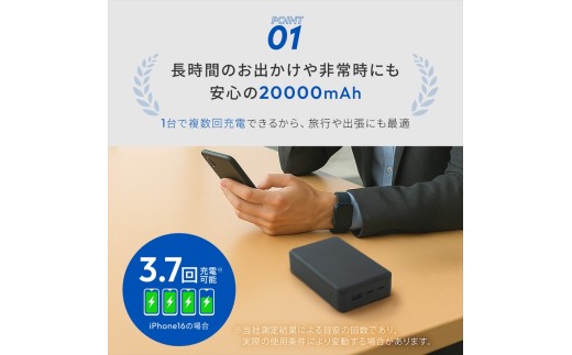本製品はオウルテックの20000mAh史上、最軽量のモバイルバッテリーです。スマートフォンを約6.7回充電できるほど大容量で、1台あると心強い存在です。 ※2025年9月時点、弊社発売の容量20000mAhのモバイルバッテリーとの比較。 ※iPhone SE(第3世代)を充電した場合の充電回数です。 iPhone 16に重なるほどのコンパクトさでありながら、スマートフォンやタブレットなど幅広く充電でき、出張先や旅行先でも活躍する大容量です。 バッテリー残量を1%単位で確認できるため、LEDランプ数の表示よりも充電のタイミングが分かりやすい仕様です。 USB PD(Power Delivery)に対応し、最大20Wで急速充電が可能です。本製品に対してはPD18Wで急速充電ができます。 【注意事項】 注意事項/備考 【飛行機への持ち込み】 多くの航空会社の機内持ち込み手荷物の規定を満たしておりますので、出張や海外旅行にご利用いただけます。 ※航空会社により機内持ち込み手荷物の規定が異なりますので、事前に各航空会社へお問い合わせください。 ※AC充電器がご使用予定の国のコンセントに対応していれば、海外でも充電は可能です。