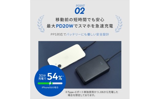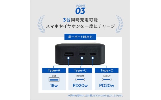 - ■対応機器:タブレット、スマートフォン、Wi-Fiルーター、加熱式たばこ、オーディオプレーヤー、その他USB充電機器 ※すべての機器での動作を保証するものではありません。 ※接続する機器に合わせたケーブルをご用意ください。本製品の付属ケーブルもお使いいただけます。 ※電熱ベストおよび空調作業服へのご使用は推奨しておりません。また、動作保証もいたしかねますので、ご購入の際はご注意ください。 ■内蔵バッテリー:リチウムイオン電池 3.85V 20000mAh 77Wh ■定格入力:USB Type-C1 / USB Type-C2:5V/3A、9V/2A、12V/1.5A(PD18W) ■定格出力: USB Type-C1 / USB Type-C2:5V/3A、9V/2.22A、12V/1.67A(PD20W) PPS 5-5.9V/3A、5-11V/2A USB Type-A:5V/3A、9V/2A、12V/1.5A(18W) 合計最大出力:5V/3A(15W) ※USB PDで充電を行う場合は、接続機器やケーブルがPD対応である必要があります。 ■定格出力容量:5V/13000mAh、9V/7700mAh、12V/5800mAh ■使用回数:約300回 ※機器および使用条件によります。 ■充電時間:空の状態から満充電まで約6時間(PD18W充電時) ■保護機能:過充電(電圧/電流)保護、過放電(電圧/電流)保護、短絡(ショート)保護、温度保護 ■使用温度: 充電時:0~35℃ 放電時:-10~35℃ ■サイズ (本体):約 70(W) × 29(D) × 115(H) mm ■重量 (本体):約 344g ■付属品: USB Type-C - USB Type-Cケーブル(約30cm) 取扱説明書(保証書付) ■PSEマーク:PSE適合製品 ■保証期間:1年間