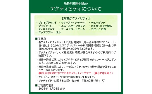 ■説明 ロッテアライリゾートにてご宿泊のご宿泊代やレストランでのご飲食代、アクティビティなど使用代金の精算に充当できる施設利用券です。(売店を含む物品購入を除く) 東京から新幹線で1時間46分、新潟空港から車で2時間に位置する新潟県妙高市。 妙高山から海まで続く山々と、遥かに広がる田園風景が目を楽しませてくれる風光明媚なところに土地にロッテアライリゾートはございます。 ロッテアライリゾートは全257室で長期滞在のお客様にも対応しております。 敷地内には国内屈指の積雪量でパウダースノーを満喫できるアライマウンテンリゾート併設(全14コース、5月中旬まで営業予定のスキー場)を始め、スパ、プール、 レストラン、カフェ、ファンクションルーム、 1,501mのアジア最長級のジップツアーやツリーアドベンチャーなど各種アクティビティを完備した、 アジアでもトップクラスの規模を誇るレジャー施設です。 冬は一面に広がる雪景色の中ウィンタースポーツを楽しみ、グリーンシーズンは新緑と澄んだ空気を感じながら山並みをご堪能いただけます。 年間を通して多彩な魅力を展開していきます。目指すは“最高のプレミアムマウンテンリゾート”。 世界中のお客様に大毛無山(おおげなしやま)の、そして地域の魅力を伝えていきたいと考えています。 ■注意事項 ※画像はイメージです。 ※不在票が入っていた場合は、速やかに再配達依頼を行ってください。 保管期間超過で返送された返礼品の再配達はできかねます。 ※発券日から1年間有効【期日経過後無効】 ※ご利用の際はあらかじめご予約ください。 ※満室や休業、イベント開催時などご利用いただけない場合がございます。 (詳しくはホテルにお問い合わせください。 ホテル・客室予約 0255-75-1100) ※本券でのつり銭の返却は致しておりませんので、あらかじめご了承くださいませ。 ※アクティビティご利用可能日 ~2025/11/24 (アクティビティに関するお問い合わせ 0255-75-1177)