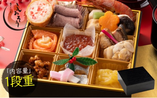 - 一段重:16品 1~2人前 ===お品書き=== 【一段重】 ローストビーフ(ソース添え)、チェリーアルメット、煮えび、煮物(えび陣笠)、煮物(ふき)、煮物(人参)、煮物(里芋)、煮物(がんも)、サーモン(カットレモン)、いくら、ブリ照り焼き、鯛照り焼きアーモンド焼き、はじかみ、かつおくるみ、にしん大漁漬け、紅白結びかまぼこ、きんとん