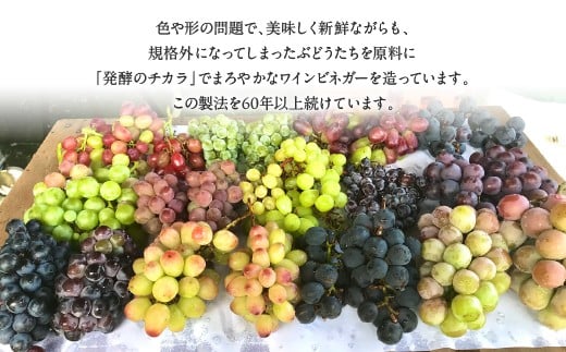 生食用としては流通できない規格外ぶどう(色、カタチは良くないが味は美味しいのです)を『発酵のチカラ』でワインビネガーにし、地域資源であるぶどうの有効活用に貢献しています。この製法を60年以上続けています。