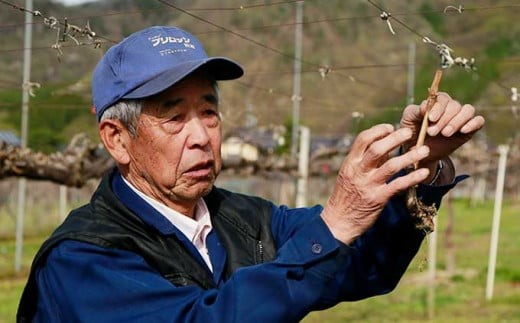 小布施町の東部に位置し、東に雁田山がそびえ、南に松川が流れる園地で50年以上ぶどうを作り続けている関谷圀弘さんは、現在では、巨峰、シャインマスカット、ナガノパープルなど10種類以上のぶどうを栽培している、まさに小布施のぶどう名人です。