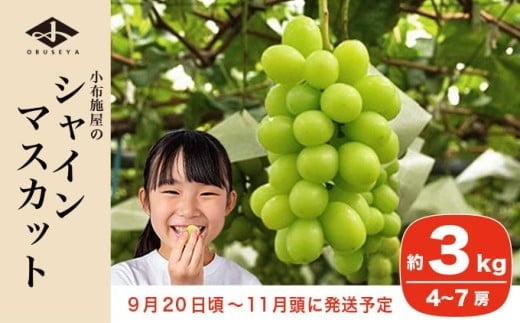 シャインマスカット 約3kg 4~7房 [小布施屋] フルーツ 果物 くだもの ぶどう 葡萄 ブドウ 数量限定 クール便配送 長野県産 産地直送 先行予約 送料無料 2025 2025年発送 令和7年産 【2025年9月20日頃~11月頭にかけて順次発送】 [C-5]