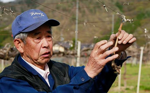 小布施町の東部に位置し、東に雁田山がそびえ、南に松川が流れる園地で50年以上ぶどうを作り続けている関谷圀弘さんは、現在では、巨峰、シャインマスカット、ナガノパープルなど10種類以上のぶどうを栽培している、まさに小布施のぶどう名人です。