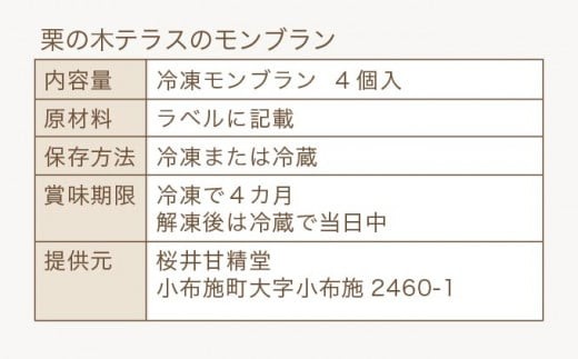 栗の木テラスのモンブラン 4個入 [桜井甘精堂]スイーツ 菓子 栗 信州 長野県 冷凍 ご当地スイーツ 数量限定人気 期間限定 お取り寄せ ケーキ 先行予約 小布施 【2025年1月16日~3月末日発送】 [D-7]