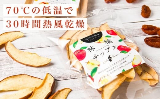 信州産ふじりんごを使用し、全て手作業で丁寧に扇形にスライスし、無塩、無糖にて70℃の低温で30時間熱風乾燥させた林檎チップスです。