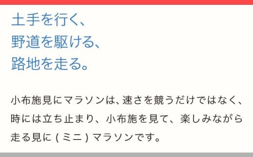 この大会は、速さを競うだけではなく、時には立ち止まり、小布施を見て、楽しみながら走る見に(ミニ)マラソンです。「土手を行く 野道を駆ける 路地を走る」というコンセプトでコースをめぐりながら、小布施の町の人とランナーの皆さん、ボランティアとご縁をつなぐ「縁走=えんそう」を楽しみましょう。