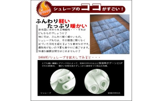 羽毛を超えた新感覚のオリジナル布団です。 素材すべて日本製。 中素材には、新素材シュレープ®を使用しています ミシン目を細かくし、直線キルトでホールド力をアップさせるなど、 ミシンの縫製にもこだわっております。 大手高級ホテルや高級旅館などにも採用されているこちらの掛布団は、 丸美寝具が自信をもってお勧めできる一品です。 〇新素材シュレープ®わたとは 東洋紡が開発した特殊な極細ポリエステル繊維。 軽くて暖かいのが特徴です。 また羽毛に比べ、綿ほこりなどが少ないので、 アレルギーをお持ちの方にも安心してお使いいただけます。 発送:丸美寝具