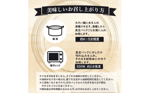 ご注文頂いてから翌日一匹ごと丁寧に仕上げた国産品の極上品\\n肉厚はさることながら秘伝のたれに十分ひたし丁寧に焼き上げた一品\\n三島の地がおりなす究極のうなぎを心ゆくまでご堪能ください。\\n\\n【お召しあがり方】\\n封を切らずにそのまま熱湯の中に入れ2~3分沸騰させてから封を切り、御飯の上に移し容器の「たれ」をかけて出来たての風味そのままでお召し上がりください。\\nご注意\\n封を切り、容器に移す際はやけどをしないよう十分ご注意ください。\\n開封後、保存はできませんのでご了承ください。