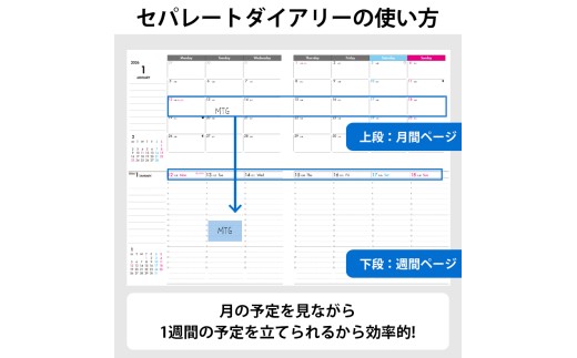 1冊の手帳が上下で分かれている手帳セパレートダイアリーです。 上下ページの組み合わせにより「月間ページ」、「週間ページ」、「TODOページ」、「ガントチャート」を同時に確認することができます。マンスリーページで全体の予定を把握しながら、週間ページで1週間の予定を組むことができます。時間軸で予定を管理することで、スキマ時間を見つけやすくなり、時間を有効に使うことができます。TODOページは、日々のやる事を整理することが可能です。書き出すことで優先順位が明確になったり、タスク漏れの防止にも繋がります。細かい予定管理に最適なため、ビジネスシーンはもちろん、ダブルワーカーの方や忙しいママさんにもおすすめの手帳です。 ~こんな方に選ばれています~ ・効率良く時間を使いたい方 ・一目で週間の予定を把握したい方 ・予定を軸にTODO管理したい方
