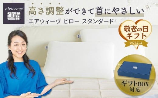 ギフト対応の返礼品となります。\\n・透明OPP袋入りラッピングした商品をキャリングケースに収納し、ギフトボックスにお入れします。\\n・お届けの際は、ギフトボックスを段ボールで梱包された状態でお届けします。\\n・ギフトボックスを単品でご注文頂くことはできません。\\n\\n【エアウィーヴ ピロー スタンダード】\\n1.抜群の通気性で睡眠の質を高める\\nエアウィーヴの枕に頭をのせると、いつの間にかスーッと眠りについてしまう。 そんな不思議な枕です。\\nその秘密は、抜群の通気性にあります。\\n実は、睡眠時に頭部は最も熱を持ち、枕の素材によっては蒸れてしまいます。 エアウィーヴの独自技術『エアファイバー』は、90%が空気でできているため、 軽量かつ通気性に優れ、内部に湿気はこもりません。\\n抜群の通気性で蒸れにくく、頭を快適な温度・湿度に保ちます。\\n\\n2.ずっと清潔、洗えて安心\\n枕は直接肌に触れるため、いつでも清潔を保ちたいもの。\\nエアウィーヴのピローは、カバーは洗濯機で、中材はシャワーで簡単に水洗いが可能。 清潔な状態を保ちたい方、寝汗が気になる方にも大変おすすめな商品です。\\n\\n3.枕1つで自分好みの寝心地に\\n枕は、体幹(頭から背骨のライン)がまっすぐになるよう高さの調整が非常に重要です。\\nエアウィーヴ ピロー スタンダードは、形状の異なる2枚の調整シートが付属し、 ご使用になっている寝具の硬さや、体形・体格に対応できる構造になっています。\\n\\n4.寝返りを妨げず、熟睡をサポート\\n「エアファイバー」の適度な反発力により、 寝返りをする際の首の動きに反応。楽に首を動かすことができます。\\n無理に力を使うことなく、あなたの動きたい方向に優しくサポート。 スッと自然に寝返りを打つことができるため、朝まで熟睡できます。\\n\\n※エアファイバーは、株式会社エアウィーヴの登録商標です。\\n\\n関連キーワード:\\nエアウィーヴ ピロー 枕 マットレスパッド クッション 安眠グッズ 快眠グッズ マットレス 寝具 快眠 おすすめ 布団 座布団 人気 クッション 洗える マットレスシングル マットレスセミダブル マットレスダブル airweave エアウィーヴ エアウィーブ