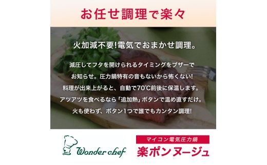 マイコン電気圧力鍋3.0L楽ポン ヌージュ  液晶サイズが大きくバックライトではっきり見やすい。\\nオート調理は人気の10メニュー。「オート」ボタンで簡単呼び出し。\\n25~70℃の低温調理(1℃単位で設定可能)も楽しめます。\\n70~99℃の調理で圧力調理とは異なる食感の料理が楽しめます。\\n調理完了後に蓋を開けなかった際には30分毎にお知らせします。\\n浜田陽子先生他監修の110レシピを付属。\\n\\n事業者:株式会社 ワンダーシェフ\\n\\n【関連キーワード】\\nキッチン用品 調理器具 圧力鍋 電気鍋 ヘルシー クッキング 時短 レシピ 便利グッズ 人気 おすすめ 送料無料 容量:マイコン電気圧力鍋3.0L 楽ポン ヌージュ\\n\\n商品サイズ 幅約31×奥行約27×高さ約28cm\\n商品重量 約3.6kg 申込:2025年7月1日~2030年6月30日 配送:ご入金確認後、10日程度で発送させていただきます ※夏季休暇のため8月8日(金)~8月18日(月)は出荷不可となります。 マイコン電気圧力鍋4.0L楽ポン ヌージュ / キッチン用品 調理器具 圧力鍋 ...  液晶サイズが大きくバックライトではっきり見やすい。\\nオート調理は人気の10メニュー。「オート」ボタンで簡単呼び出し。\\n25~70℃の低温調理(1℃単位で設定可能)も楽しめます。\\n70~99℃の調理で圧力調理とは異なる食感の料理が楽しめます。\\n調理完了後に蓋を開けなかった際には30分毎にお知らせします。\\n浜田陽子先生他監修の110レシピを付属。\\n\\n\\n事業者:株式会社 ワンダーシェフ\\n\\n【関連キーワード】\\nキッチン用品 調理器具 圧力鍋 電気鍋 ヘルシー クッキング 時短 レシピ 便利グッズ 人気 おすすめ 送料無料 容量:マイコン電気圧力鍋4.0L楽ポン ヌージュ\\n\\n商品サイズ 幅約33×奥行約28×高さ約30cm\\n商品重量 約4.2kg 申込:2025年7月1日~2030年6月30日 配送:ご入金確認後、10日程度で発送させていただきます ※夏季休暇のため8月8日(金)~8月18日(月)は出荷不可となります。