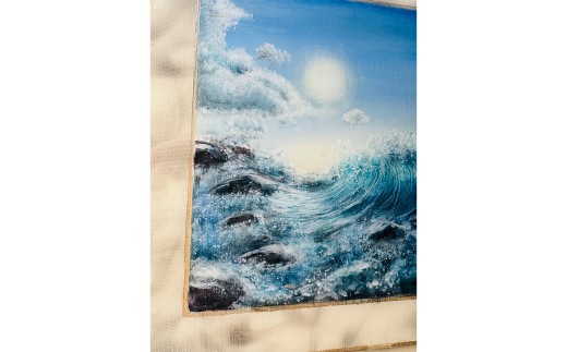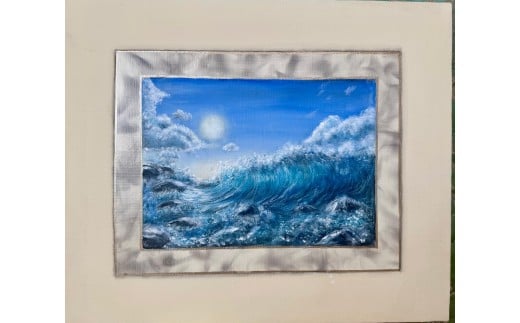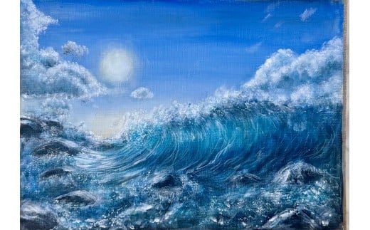 この作品はキャンバスF8号にアクリル絵の具を直接使用して描いた作品です。 波が躍動する様子を細かな描写で表しています。 青い空と隆起して迫る波の細かさを表現するのにかなりの時間を要しました。 明るいところに飾るとレジン仕上げのキラキラが更に際立たせてくれます。 サイズは縦38cm×横45.5cm×厚み1.8cm。 完成した作品のため一点限りです。 【注意事項】 ※こわれ物扱いでの取扱いをお願いします。 ■提供事業者:Atelier La Sylphide