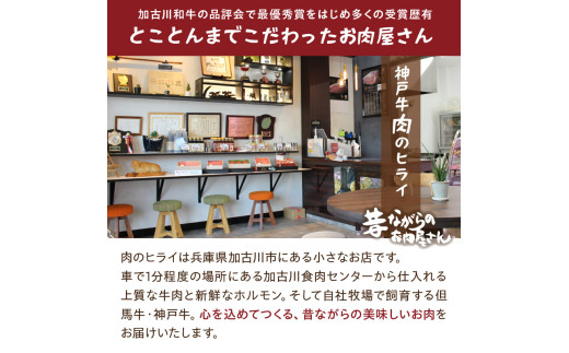 肉のヒライでは直営のヒライ牧場で飼育した但馬牛(神戸牛の素牛)の中から厳選した神戸牛を販売している加古川市にある小さな精肉店です。\\nヒライの神戸牛は見た目や霜降りだけではなく、旨味や風味などの美味しさにこだわった牛肉を目指して飼育しています。\\nオリジナルの配合飼料をはじめ、 独自の飼育方法で育った牛肉は第6回全国但馬牛枝肉共進会で名誉賞を受賞し、様々な共進会で入賞しています。\\nまた、加古川市では地域ブランド加古川和牛として親しまれています。\\n\\n【着日指定不可】\\n※「平日希望」「土日祝日希望」「○日不在につきそれ以外の日で希望」などの軽微な内容であればお受けいたします。\\n詳しくは備考欄またはメッセージ欄等にてお問合せください。\\n\\n※画像はイメージです。\\n\\n【保存方法】\\n冷凍\\n\\n【注意事項】\\n※解凍後はすぐにお召し上がりください。\\n※12月お申込み分は、1月以降に順次発送。\\n\\n【地場産品類型】\\n2\\n\\n【類型該当理由】\\n加古川市内において返礼品等の原材料の主要な部分が生産されたもの\\n\\n【注目キーワード】\\n神戸牛 自社牧場直送 肉のヒライ すき焼き しゃぶしゃぶ 国産 送料無料 お取り寄せ 肉 牛肉 美味しい おすすめ