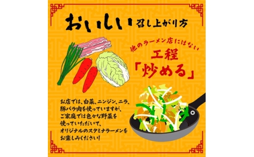 辛いけどまろやかな深いコクとおいしさを実現できたこだわりのラーメンです。 お店では、白菜、ニンジン、ニラ、豚バラ肉を使っていますが、ご家庭では色々な野菜を使っていただいて、オリジナルのスタミナラーメンをお楽しみください! 「一度食べたらクセになる!」「忘れられない!」そんなラーメンを目指しています。 ■注意事項/その他 ※画像はイメージです。