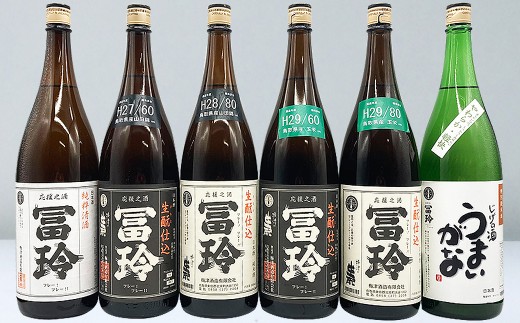 - 冨玲 上撰 1800ml×1、『うまいがな軽快』 1800ml×1、『冨玲(フレー) 生モト仕込』山田錦60% 1800ml×1、『冨玲(フレー) 生モト仕込』山田錦80% 1800ml×1、『冨玲(フレー) 生モト仕込』玉栄60% 1800ml×1、『冨玲(フレー) 生モト仕込』玉栄80% 1800ml×1