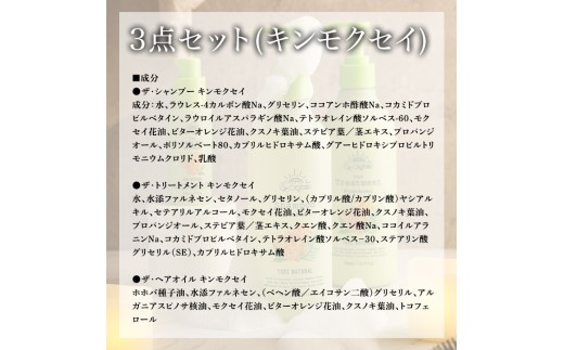容量:<シトラスの香り>\\n・ザ・シャンプー シトラス:500ml\\n・ザ・トリートメント シトラス:500ml\\n・ザ・ヘアオイル シトラス:80ml\\n\\n<キンモクセイの香り>\\n・ザ・シャンプー キンモクセイ:500ml\\n・ザ・トリートメント キンモクセイ:500ml\\n・ザ・ヘアオイル キンモクセイ:80ml\\n上記よりお選びください\\n\\n※15/e organic ブランドロゴ入りギフトボックスに入れてお届けいたします