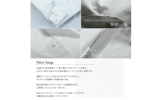 玉野市に工場を構え約30年。 これまで数々の有名テーラーやセレクトショップにオーダーシャツを供給してきたドゥ・ワン・ソーイングのオリジナルブランド『土井縫工所』の既製品シャツです。 長年オーダーシャツで培ってきた縫製技術とこだわりの仕様を、既製品にも惜しみなく反映しました。 MADE IN TAMANO の土井縫工所ドレスシャツの着心地をお楽しみください。 ※受注生産となりますのでお届けまでお時間をいただきます。 ◆生地 50番手の糸を使用し、丁寧に織り上げたブロード生地は、ほどよい厚みと滑らかさを兼ね備えたバランスの良い素材です。 適度なハリとコシがありながらもゴワつきがなく、さらりとした肌触りで快適な着心地。 透け感を抑えたホワイトカラーは清潔感があり、日常使いにぴったりの一枚です。 毎日のビジネスシーンにも安心してお使いいただける、信頼感のある定番ファブリックです。 ◆デザイン仕様 ボディは、背中にタックを配したゆったりとしたクラシカルフィット。動きやすさと上品さを兼ね備えた設計です。 襟型はカジュアルにもドレスにも使えるボタンダウンカラー。襟に合わせ表前立てを採用しています。 カフスは、どんなシーンにもマッチする定番の大丸型(ラウンドカフス)で、アジャストボタン付きのため、袖まわりのサイズ調整も可能です。 釦は土井縫工所標準仕様の白蝶貝釦です。 ドレスシャツ 土井縫工所オンラインショップ ワイシャツ メンズ ビジネス 日本製 ※画像はイメージです。 ※商品のお作り置きはしておりません。ご注文をいただいてからの生産となります。 ※発送までは12~15営業日を頂戴しております。 ※照明やご覧のモニターにより色が異なって見えることがございます。 ※サイズ指定がご不明な場合は土井縫工所オンラインショップ内【サイズの測り方】をご参照ください。 ※サイズはXS~2XLからお選びいただけます。