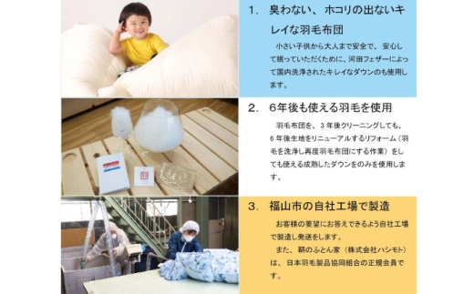 ※鞆のふとん家のその時工場にある生地を使用して製造するため柄任せとなります。(品質に問題はございません。) 河田フェザーの高い洗浄技術により、臭いやホコリが少ない清潔な羽毛布団。 400ダウンパワーのフランス産ダウンがふっくらと暖かく、抗菌防臭・ダニ防止加工で冬の眠りを快適にサポートします。 ■こだわりの羽毛と安心の品質 羽毛は、国内有数の洗浄技術を持つ河田フェザーの「真羽毛」を使用。 高品質なフランス産ホワイトダックの400ダウンパワーによって、驚きのボリュームと暖かさで、寒さしらずの冬が過ごせます。 臭いやホコリが少なく、清潔で快適な睡眠環境を求める方のために最適です。 成熟したダウンボールの大きな羽毛を丁寧に洗浄しているため、少ない量でもかさ高があり、保温性に優れています。 また、羽毛のトレーサビリティ(追跡可能性)も確保されており、安心してお使いいただけます。 ■快適な寝心地を追求した生地と製法 ふとん生地は、なめらかな肌触りの綿100%の高級サテン生地(シルクタッチ)を使用しています。 ソフトな風合いで掛け心地が良く、冷気をしっかりシャットアウト。 いやなにおいが発生するのを防ぐ、抗菌防臭・ダニ通過防止加工の生地が使用されています。 SEKマークの安全試験をクリアし、繊維上の細菌の増殖を抑制、防縮効果があります。 さらに、5cmマチの立体キルトで羽毛の片寄りを防ぎ、暖気を逃しません。 ■株式会社ハシモト 株式会社ハシモトは、1949年の創業以来、広島県福山市・鞆の浦で寝具と手芸用品を製造販売している老舗メーカーです。 長年にわたり「made in Fukuyama」にこだわり、職人が一針ずつ心を込めて手作業でふとんを製造しています。 お客様一人ひとりに寄り添い、丁寧なものづくりを続けています。 羽毛布団 羽毛 掛け布団 掛布団 布団 シングル 日本製 冬 毛布 保温 保温性 あったかい 暖かい 軽量 軽い 抗菌 防臭 寝具 フェザー ダウン ホワイトダウン 綿100% シルク サテン
