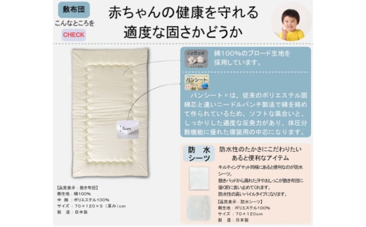 - ■サイズ ベビー肌布団:85cm×120cm ベビー敷きパッド:70cm×120cm ■重量 ベビー肌布団 ふとん綿:0.2kg 総目方:0.5kg ベビー敷きパッド ふとん綿:0.2kg 総目方:0.5kg ■原材料 ベビー肌布団 側生地:ポリエステル70% 綿30% (クールマックス) ふとん綿:ポリエステル60% 指定外繊維40% ベビー敷きパッド 側生地:ポリエステル70% 綿30% (クールマックス) ふとん綿:ポリエステル60% 指定外繊維40% ベビー敷き布団 側生地:綿100% ふとん綿:ポリエステル100% 敷き布団カバー 側生地:ポリエステル70% 綿30% (クールマックス) 防水シーツ 側生地:ポリエステル100% 【原料原産地】 側生地:日本製 中綿:日本製 【加工地】 広島県福山市
