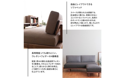 スペースが限られたお部屋に置いても圧迫感のない、コンパクトな作りのソファベッドです。サイドの肘掛けを排したデザインのため、レイアウトは自由自在。別売りのオットマンをソファの前に配いて足を伸ばして座ったり、左右に配置して足を伸ばして寝ころんだり、単体でスツールとして使ったり…。幅広い使い方が可能です。 木製部分は、カバー生地やお部屋の雰囲気に合わせて、ウォールナット、オーク、チェリー材の3種類からお選びください。ウォールナット材は落ち着いた色調と美しい木肌で高級感があり、チェリー材は緻密でなめらかな木肌を持ち、経年変化で深く豊かな色合いが楽しめ、オーク材は明るい色味にはっきりとした木目の美しさが映える木材です。カバー生地は10数種類の中からお選びいただけます。 それぞれ密度・厚みの異なる高品質ウレタンを4層に重ねることで、心からくつろげる座り心地を実現しました。やや硬めの座面はほどよい弾力がありつつ、しっかりと体を支えてくれます。長時間座っていても疲れにくく、ラクに姿勢を変えることができます。 背もたれ部分はクッションの取り外しが可能で、フレームの角度も変えることができます。床板をサイドテーブルとしても使用できるほか、背もたれのクッションを置けばより広々としたベッドに。 「府中家具」を受け継ぐものづくり 300年以上続く府中の木工文化から生まれた家具は、木目や手触りを生かす丁寧な手仕上げが魅力。その技を受け継ぎ、暮らしに馴染む丈夫で美しい道具を作り続けています。 本返礼品の主要な部分は、府中市にて生産、製造または加工したものが占めております。