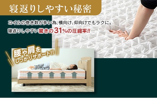 お客様満足度の高い「夜香」シリーズのマットレスをさらに進化させた「咲夜」ポケットコイルマットレスが新登場! ベッド専門情報サイト「椚大輔のベッド選び」の「専門家が選ぶ本当におすすめのマットレスはコレ!」で、【総合評価 No.1】を獲得したマットレスです。 高級ホテルでも採用される巻き数の多いスプリング ポケットコイルマットレスは、スプリング1つ1つが独立していることで、体のラインに沿って細かくフィットして体圧を分散してくれるのが特長。 また、隣に寝ている人に振動が伝わりにくいのもメリットです。 「咲夜」シリーズのポケットコイルには、6.7インチハイクオリティスプリングを採用。通常より高さがあり巻き数が多いスプリングは、バネがつぶれにくく、滑らかな動きが得られるため、寝心地も柔らかくふんわり。押し戻しも滑らかなので圧力を感じにくく、仰向けでも横向けでもラクな、心地よい寝姿勢を整えてくれます。 自分に合った寝心地(硬さ)を3タイプから選べます マットレスの硬さがフィット(やわらかめ)、ジャスト(標準・普通)、キープ(硬め)の3種類からお選びいただけます。 (フィット)ほどよい柔らかさ。フィット感がお好きな方、硬い寝心地が苦手な方におすすめ (ジャスト)一番ポピュラーな寝心地。硬すぎず、柔らかすぎず、平均的にどなたでも合いやすい硬さ (キープ)しっかりとした硬めの寝心地。沈み込みが気になる方におすすめ 老舗ベッドメーカーのこだわりが満載 ■徹底した品質管理 北広島町の自社工場でバネから製造する国産マットレスです。 ■国内最高クラスの硬鋼線 寝返りをサポートする反発力と高い耐久性を追求 ■エッジハード加工 マットレスの両サイドのコイルを太くして補強し、端の沈み込みを軽減。2枚並べて使用しても真ん中の沈み込みが少なく、枠線のあたりもないので快適です。※キープタイプは全面のコイル線径を太くしているため、端と中心の線径の差はありません。 ■コンパクト梱包 圧縮梱包でお届けするので、大型配送ではなく佐川急便の通常宅配便でお届けします。