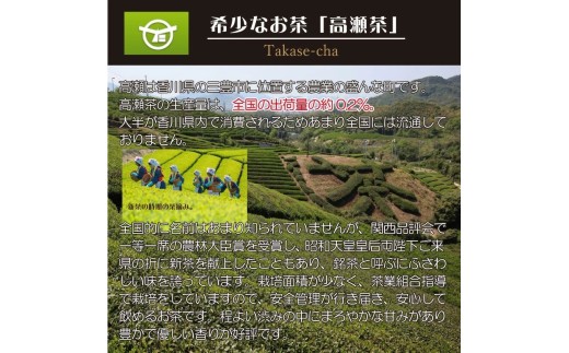 ●返礼品紹介 【高瀬銘茶】高瀬(たかせ) 八十八夜頃に摘まれた茶葉を原料に作りました。お湯を冷ましてゆっくりと淹れてください。お茶の持つ自然の甘味をお楽しみください。 ●生産者の声 四国はこんぴらさんの裏山の茶畑で採れる「高瀬茶」は豊かな自然の恵みを受けて栽培されています。茶葉のもつ旨みを損なわないように大切に製造加工いたしました。爽やかな香りと上品な旨みをお楽しみください。 ●製造者紹介【高瀬茶業組合】 高瀬は香川県の三豊市に位置する農業の盛んな町です。高瀬茶の生産量は、全国の出荷量の約0.2%。大半が香川県内で消費されるためあまり全国には流通しておりませんが、関西品評会で一等一席の農林大臣賞を受賞し、昭和天皇皇后両陛下ご来県の折に新茶を献上したこともあり、銘茶と呼ぶにふさわしい味を誇っています。栽培面積が少なく、茶業組合指導で栽培をしていますので、安全管理が行き届き、安心して飲めるお茶です。程よい渋みの中にまろやかな甘みがあり豊かで優しい香りが好評です。 三豊市内で生産された茶葉を使用し三豊市内の加工所で製造されたお茶です。