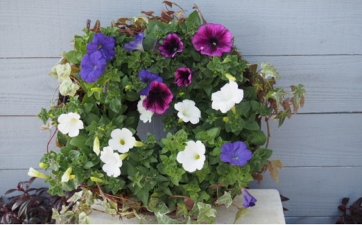 ドーナツ型のカズラ製バスケットに、季節のお花を植込みました。 丸い形が可愛いフワラーサークルハンキング掛けて飾ったり、立掛けたり置き場所いろいろ。朝倉市のガーデニングショップ「四季の里」よりお届け致します。製造地:福岡県朝倉市 ●置場所…明るい日向 ●水やり…乾いたら水がしみ出るくらいたっぷりあげてください ●サイズ…直径約30cm ※画像はイメージです。 ※離島にはお届けできません。 ※お植えする植物は、季節によって種類がかわります。 ※季節のお花は、季節の旬のお花、を厳選しお植え致します。 ※春…マーガレット、ラベンダー、ミニバラ、スカビオサ、ペチュニアなど。 夏…日々草、ペンタス、ペチュニア、ベゴニア、など。 秋・冬…ビオラ、パンジー、アリッサム、葉牡丹、プリムラ、、ガーデンシクラメン、カルーナーなど キーワード:ガーデニング