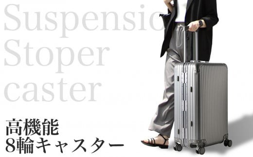 ・ショック吸収サスペンション付きキャスター\\nスーツケースの走行を支えるキャスターにはショック吸収サスペンション付きの静音キャスターを採用。\\n段差や地面の凹凸でもショックを吸収し安定した静かな走行を可能にします。\\n\\n・電車の中でもスーツケースを固定できるキャスターストッパー\\nキャスター4輪全てにキャスターストッパーを搭載。\\n電車の中などスーツケースが自走してしまう場所で使うとスーツケースを固定できる便利な機能です。\\n\\n・頑丈なアルミマグネシウム合金製フレーム\\n本体を繋ぐ結合部にはアルミマグネシウム合金を使用したフレームを採用。\\n\\n・鍵紛失の心配がいらない「ダイヤル式TSAロック」\\nスーツケースを守るセキュリティにはダイヤル式TSAロックを採用。\\n\\n・強度が高く軽量な多段式キャリーバー\\nスーツケースを走行させる際に使用するキャリーバーはスーツケースの重みを一手に引き受ける縁の下の力持ちです。\\n\\n・使いやすいオートリターンハンドル\\n本体上部とサイドに搭載されたハンドルはオートリターンハンドルを採用。\\n自動的に元に戻るオートリターンハンドルは長時間持てるよう人間工学に基づいた設計となっています。\\n\\n・「お名前印字サービス」\\nレーザー刻印サービスを行っています。ご希望の方は、お申込前に「備考」より、ご希望のローマ字表記をご入力くださいませ。\\n例) K.ooki\\n※印字場所はキャリーバーの部分のみとなります。\\n※印字フォントは「明朝体」となり、変更はできません。\\n\\n※ダイヤル式TSAロックにはシリンダー錠が同封されていません。TSAロックに設けられた鍵穴は空港職員が荷物検査をする際に使用するものです。お客様がご使用になられる場合はダイヤルでの施錠・解錠のみとなります。\\n※ダイヤル錠のセット番号を喪失した場合は000~999まで一つずつ解錠できるかをお試しください。\\n※キャリーバーのグラつきは摩擦によるキャリーバーの稼働性能低下を防ぐために設けられておりキャリーバーの強度不足によるものではございませんのでご了承ください。\\n※寄附申込みのキャンセル、返礼品の変更・返品はできません。あらかじめご了承ください。