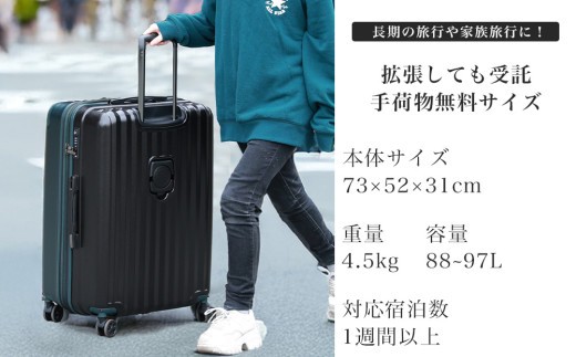 ■拡張しても受託手荷物対応の最適サイズ 大容量の88L収納が可能な受託手荷物サイズは拡張した97Lの場合でも受託手荷物に対応する最適サイズです。帰りのお土産を入れてもオーバーチャージの心配がない安心サイズです。 ■エンボス加工の大人びたデザイン 本体表面にはエンボス加工を施し傷が目立ちにくくエンボス加工による落ち着いた雰囲気によりシックでオトナなデザインに仕上がっています。 ■ストレスフリーな静音8輪キャスター スーツケースの走行を支えるキャスターには高い静音性で人気の一体成型静音8輪キャスターを採用。早朝や深夜の移動でも安心で周りの人に迷惑の掛からない仕様です。 ■お土産もまとめて収納するエキスパンド拡張機能 メインファスナーと別に用意されたエキスパンド拡張ファスナーを開くことで本体が拡張子約10%容量UP!帰りに買ったお土産や帰省先での手土産などもまとめて収納出来ます。 ■セキュリティ強度の高いダブルファスナー メインファスナーには二重構造のダブルファスナーを採用!海外旅行でも安心の高いセキュリティ性能を発揮します。 ■荷崩れ防止の贅沢なダブルパーテーション仕様 インナーデザインはダブルパーテーション仕様となっており、クロスバンドだけではなくパーテーションでも荷物を保護することで荷崩れ防止に役立ちます。パーテーションには大型メッシュポケットを搭載しているため取り出し頻度の高い小物などの収納に便利です。 ■安定感の高いRombusキャリーバー スーツケースの移動に使うキャリーバーにはひし形で安定感の高いRombusキャリーバーを採用。2輪走行だけではなくバランスの取りづらい4輪走行時でも高い安定感を発揮します。