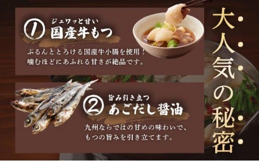 大ぶりにカットしたもつの、噛むほどにじゅわ~っとあふれる甘くクリーミーな味わいがたまりません。 あごだし醤油仕立てのスープは九州ならではの甘めの味わいで、もつの旨みを引き立てます。 キャベツやニラ、豆腐などを入れて煮込むだけで、本場博多のもつ鍋が手軽にご家庭でお楽しみいただけます。 ちゃんぽん麺もついているので、〆はまずはちゃんぽんで、残ったスープにごはん(ご家庭でご準備ください。)を入れてお楽しみください。 〈原材料名〉 【牛もつ】牛小腸(国産) 【スープ】(濃縮タイプ) しょうゆ、アミノ酸液、還元水あめ、砂糖、食塩、たん白加水分解物、焼きあごだし、ポークエキス/調味料(アミノ酸等)、酒精、増粘剤(キサンタン)、甘味料(カンゾウ)、(一部に小麦・大豆・豚肉を含む) 【ちゃんぽん麺】小麦粉、澱粉、乾燥卵白、植物性蛋白、食塩/かんすい、焼成Ca、着色料(クチナシ)、(一部に卵・小麦を含む)