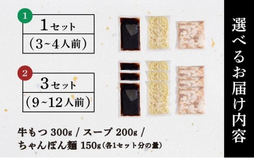 - 【1セット】 ①牛もつ 300g ②スープ 200g ③ちゃんぽん麺 150g 【3セット】 ①牛もつ 300g×3 ②スープ 200g×3 ③ちゃんぽん麺 150g×3